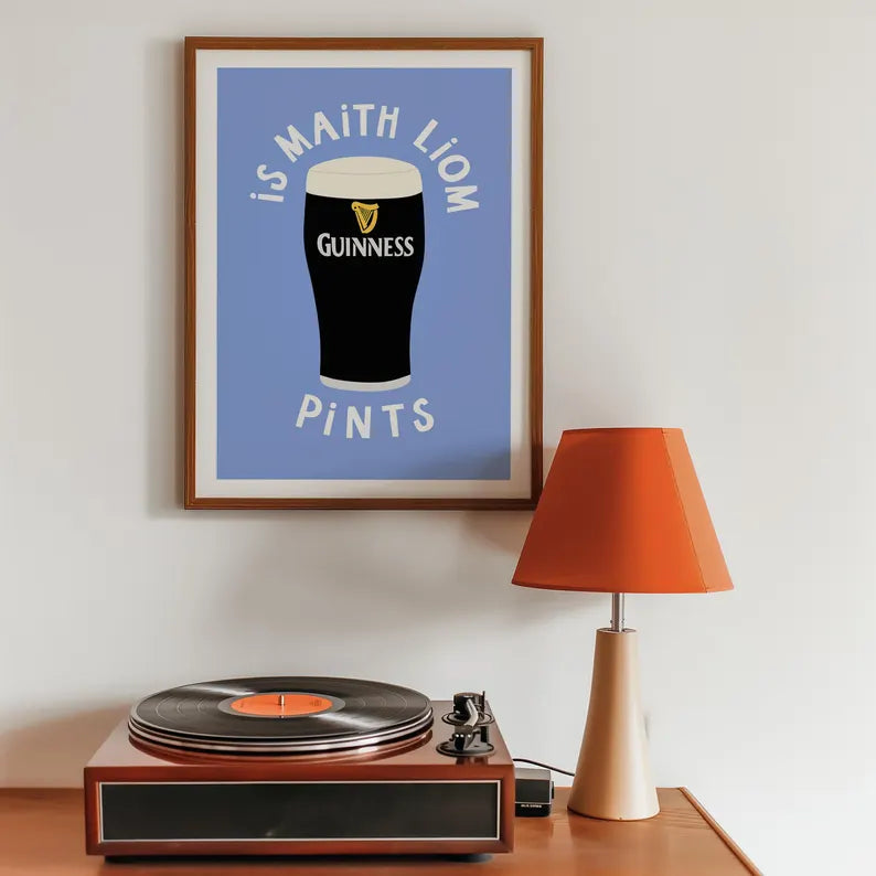 “Is Maith Liom Pints" - An illustration print of a pint of Guinness, against a blue background. A funny Irish art print to add to the walls of your home.