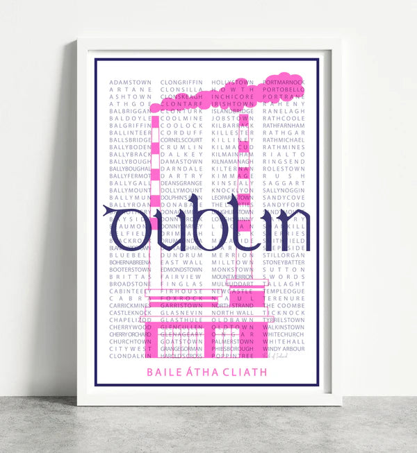 Dublin Towns Print including alphabetically listed towns around county Dublin and illustration of the Poolbeg Chimneys.